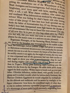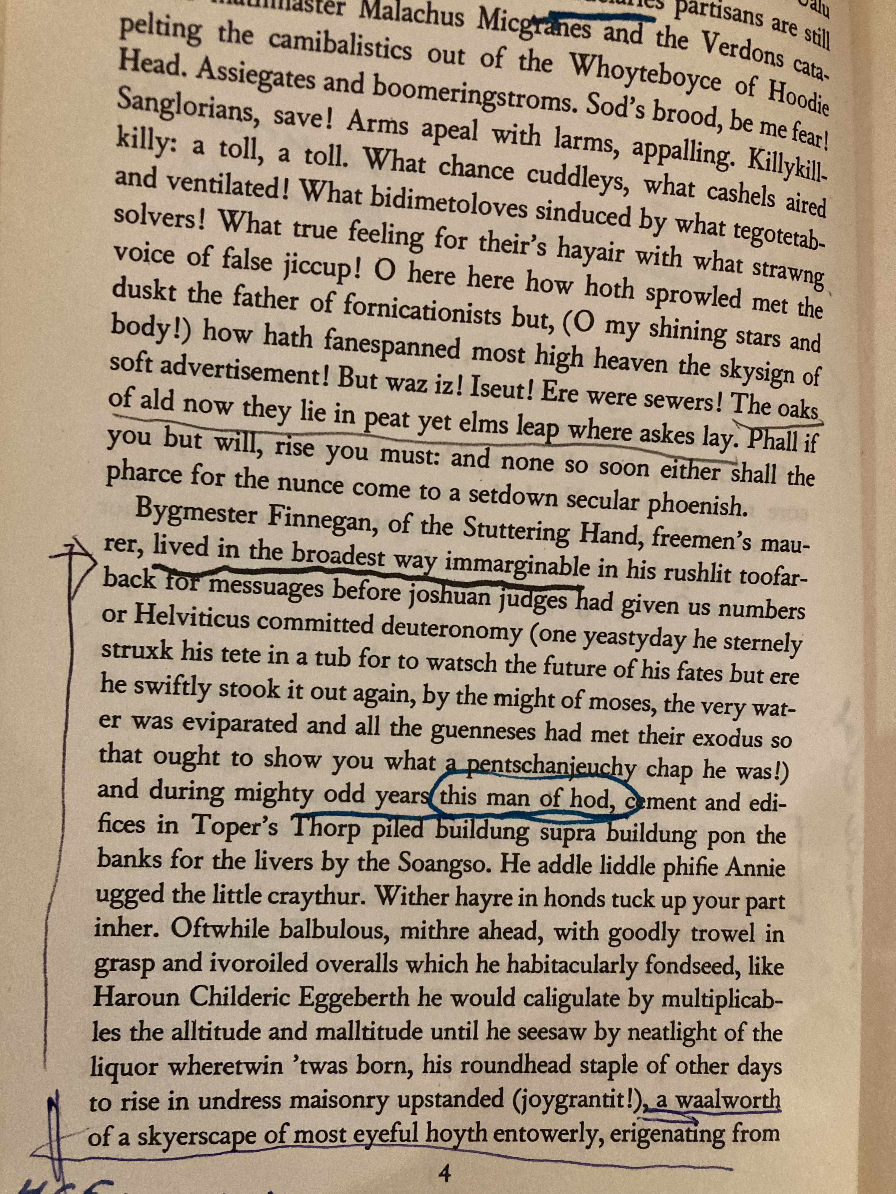 There are many such words that I’ve recorded in my notebook devoted to Finnegans Wake, single words and groups of words that signify the something that Beckett spoke about. I’ve got my own personal favorites, yet one phrasing early on in Finnegans Wake is perhaps my absolute favorite. It’s when Joyce introduces Earwicker, sets the scene, saying his fallen man of the hod “lived in the broadest way immarginable.” I’ve used this as a sort of personal axiom, my own personal mantra that becomes a constant urging, a note to self. I also believe it becomes a kind of aide-memoire of what it means today to be on the Left, how a progressive person might live in a world increasingly hostile to their viewpoint.
